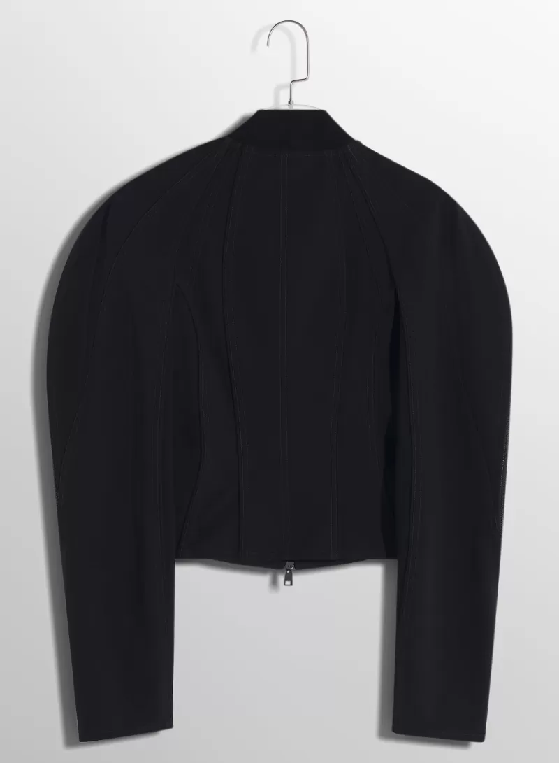 oversized shouldersmultiple panelstwo-way zipper on sleeves