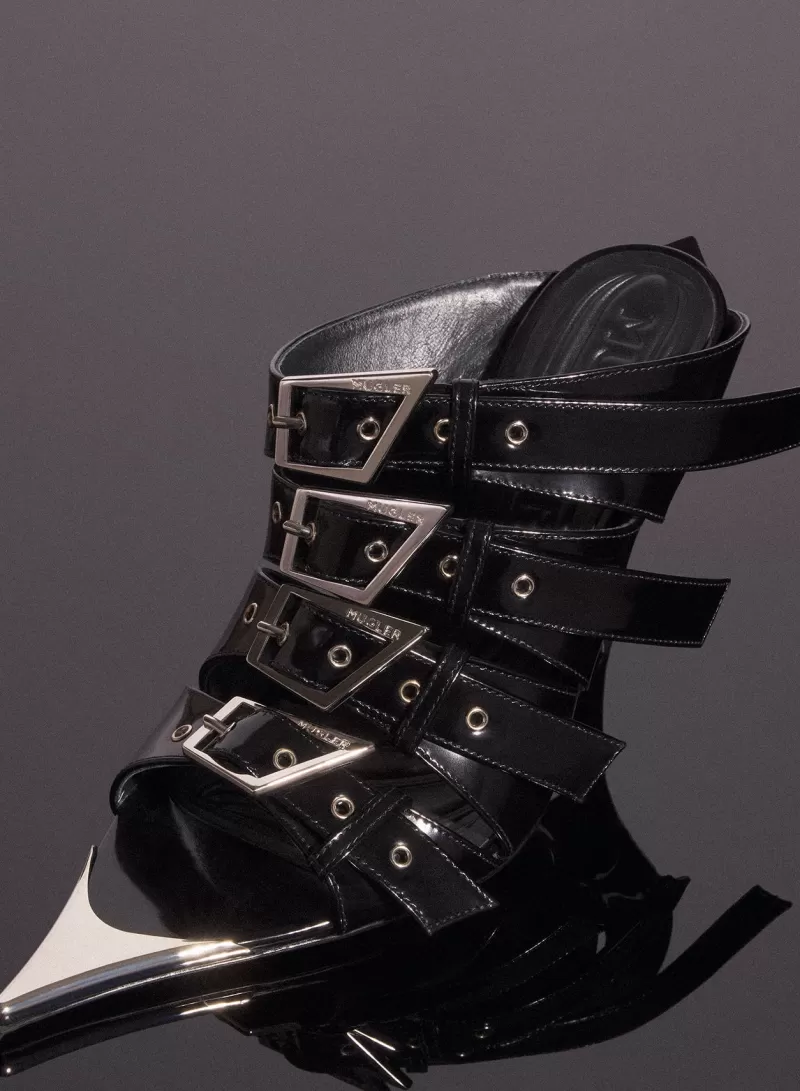 Cheap MUGLER black shiny leather buckled fang 95 sandals