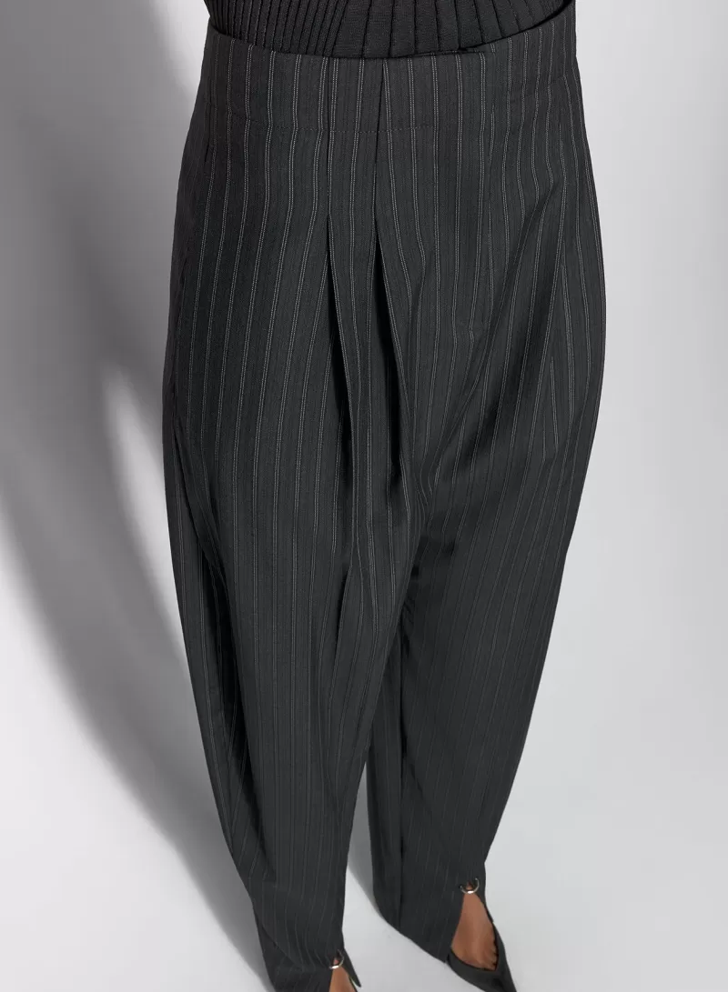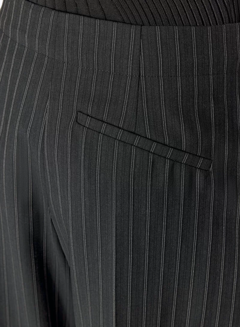 high-waisted trouserspinstripe patternwide legpiercing buckles in frontankle slits