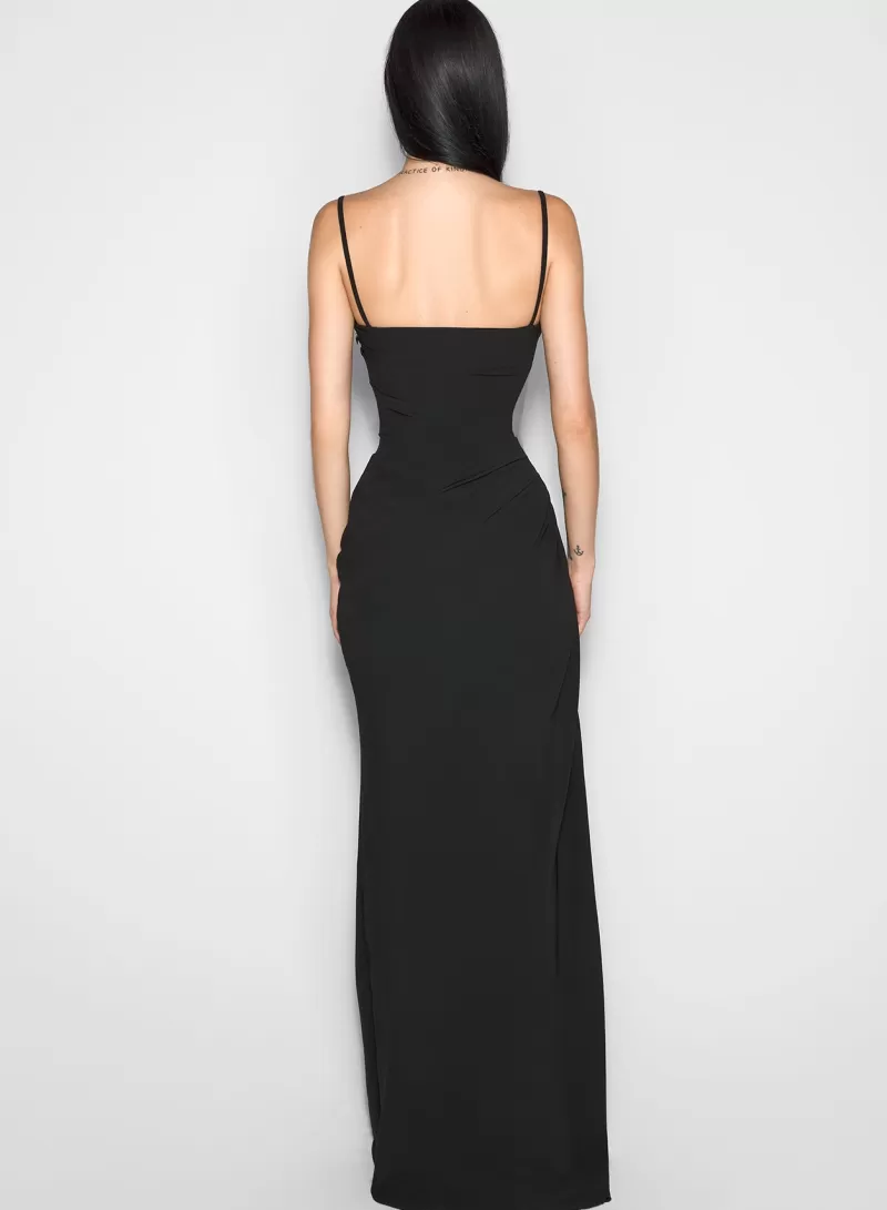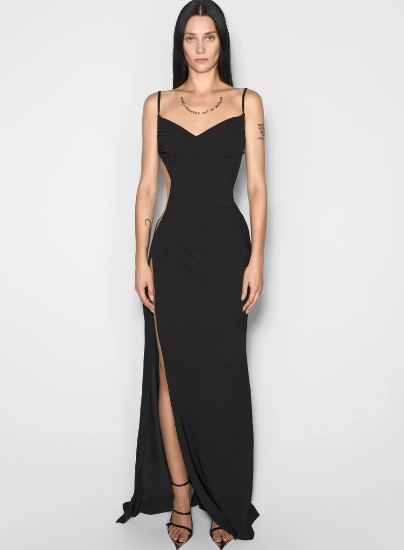 Fitted silhouettethin strapsCut-out detailing at the waistThigh-high slit